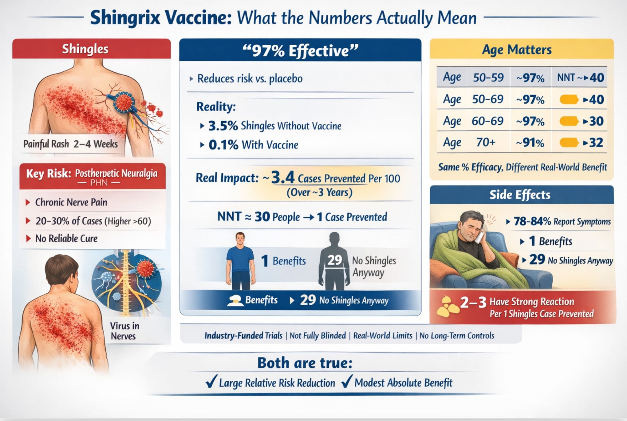 But, and this is important, the absolute benefit varies by age because older people face a higher baseline risk of shingles. More cases to prevent means more absolute benefit per vaccination