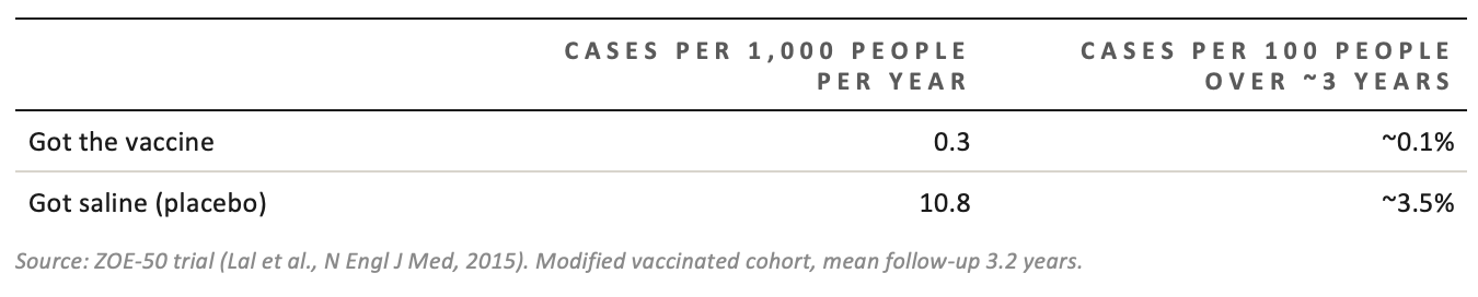 Source: ZOE-50 trial (Lal et al., N Engl J Med, 2015). Modified vaccinated cohort, mean follow-up 3.2 years.