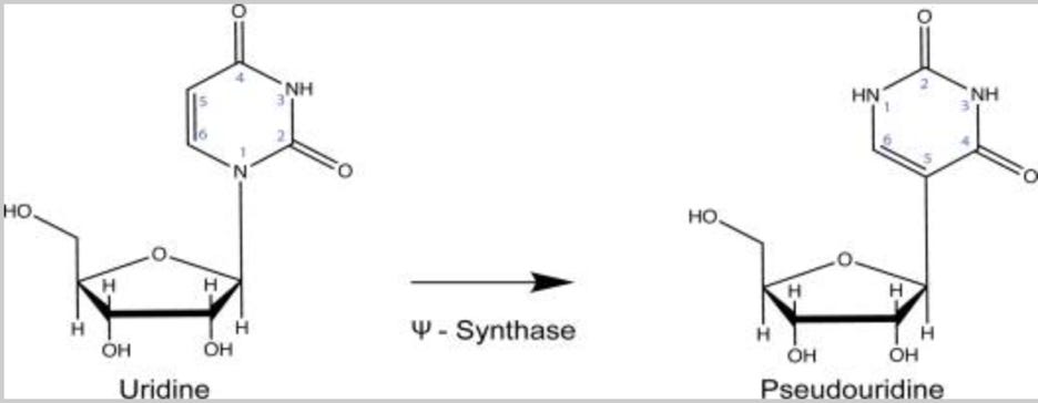 What is pseudouridine (shorthand symbol Ψ)? Pseudouridine is a modified nucleotide mRNA subunit that is prevalent in natural human mRNAs, and the biologic significance and regulation of the modification process is still being determined and understood. This modification occurs naturally in the cells of our body, in a highly regulated manner. This is in sharp contrast to the random incorporation of synthetic pseudouridine which occurs with the manufacturing process used for producing the Moderna and Pfizer/BioNTech (but not CureVac) COVID-19 “mRNA” vaccines. The “state of the art” of understanding of the biology of natural pseudouridine modifications is summarized circa late 2020 in this excellent review published in the journal Annual Review of Genetics by Erin K Borchardt et al. The open source version (not paywall protected) can be found here. Hang on, because we are about to dive into some serious immunology, molecular and cell biology.