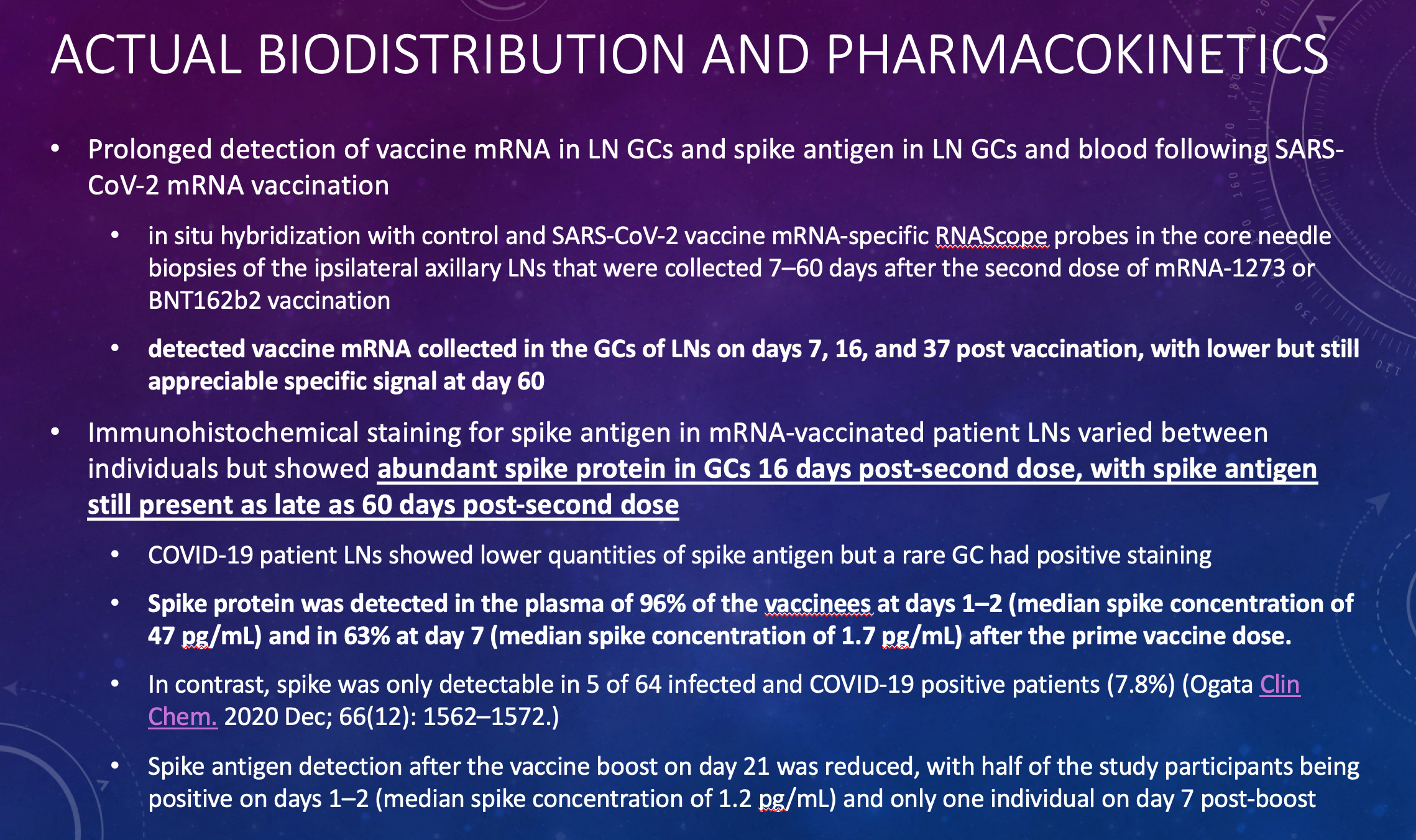 But now we know that the “mRNA” from the Pfizer/BioNTech and Moderna vaccines which incorporates the synthetic nucleotide pseudouridine can persist in lymph nodes for at least 60 days after injection. This is not natural, and this is not really mRNA. These molecules have genetic elements similar to those of natural mRNA, but they are clearly far more resistant to the enzymes which normally degrade natural mRNA, seem to be capable of producing high levels of protein for extended periods, and seem to evade normal immunologic mechanisms for eliminating cells which produce foreign proteins which are not normally observed in the body.