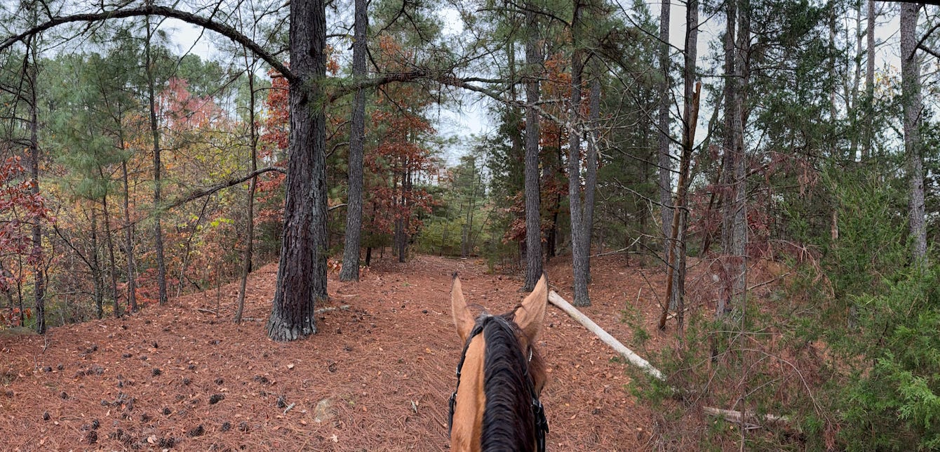 Sometimes I just drop the reins and let him decide where we are going to go, as his ears flick before and aft - listening, processing, and just being in the moment with me. He likes to shamble along, exploring the path that lies before us. This is where I find my inner peace, and I like to think he does too. In a forest I know well, surrounded by a vast ecosystem for which I am one tiny fragment.