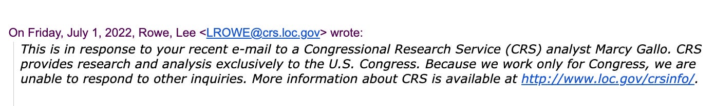 The Congressional Research Services (CRS) then put out a book for Congress entitled: "mRNA Technologies: A Primer", published in May 2022. This is the government record on the history of mRNA vaccination and technologies. Again, the invention and timeline (the CRS taken from the Nature article above) is not just wrong, it is glaringly false. When the CRS was contacted, they refused to engage and correct their publication, a screen shot of the CRS reply is here: