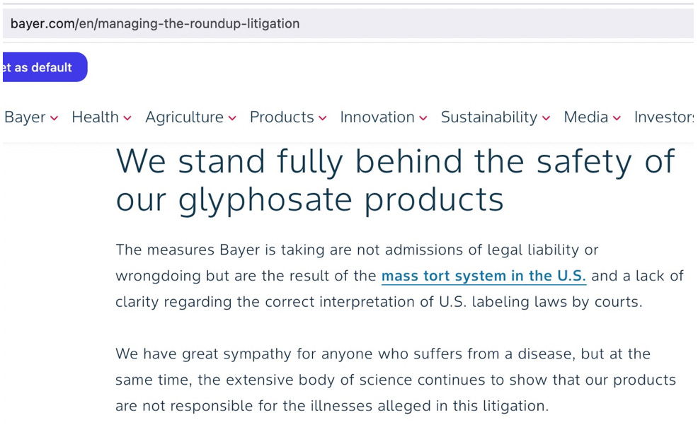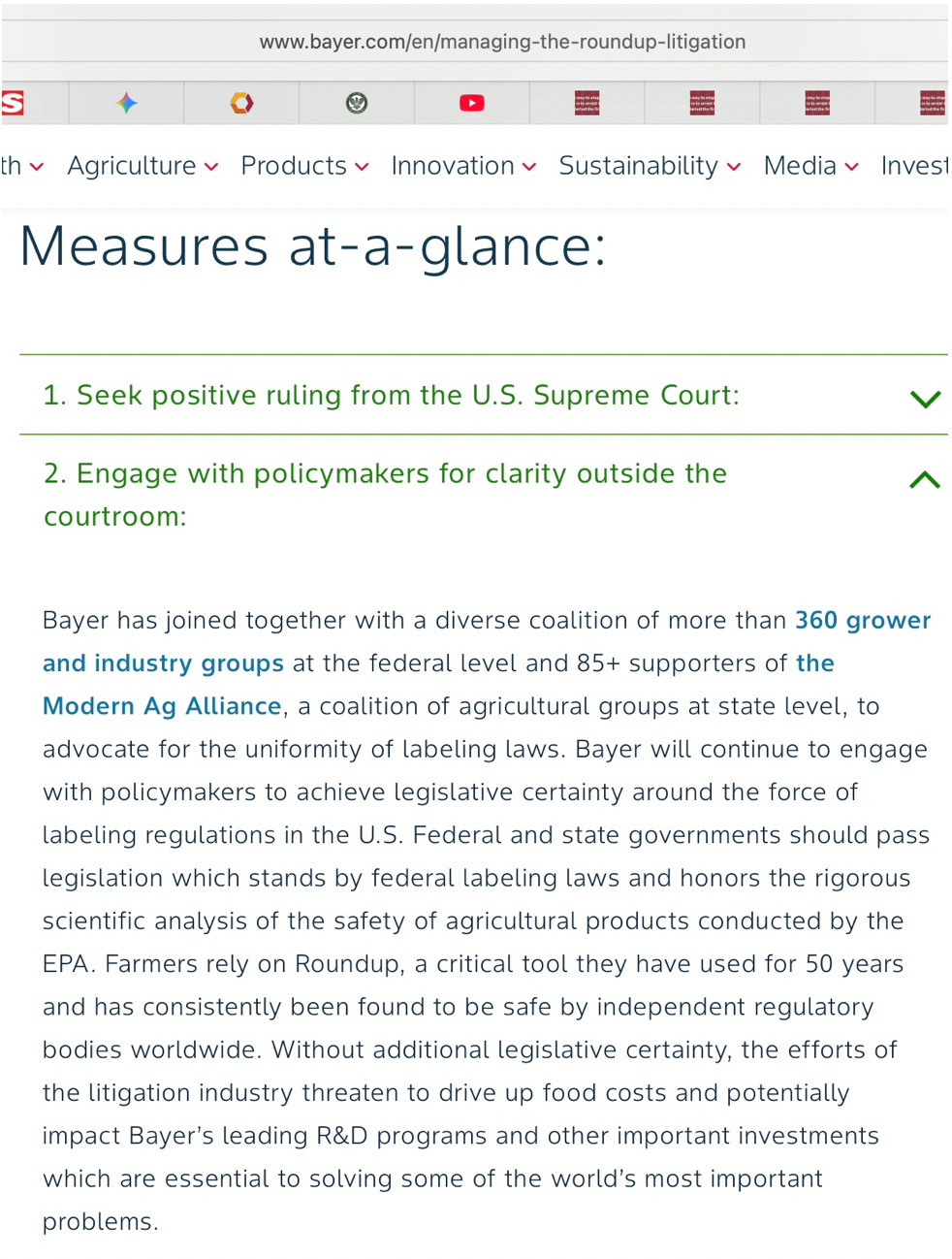 When even Bayer's own website, and the CEO of Bayer told his shareholders that this was what Bayer would be seeking (a solution to its tort liability) it is the height of brazenness for Congressmembers to try and deny it. Clearly, they fear being caught voting for a measure that can only harm their constituents. They feel, or have been told, that it is safest to deny they knew what they were voting for. Don't let this fool you! Put their feet to the fire if members' offices try and tell you differently.