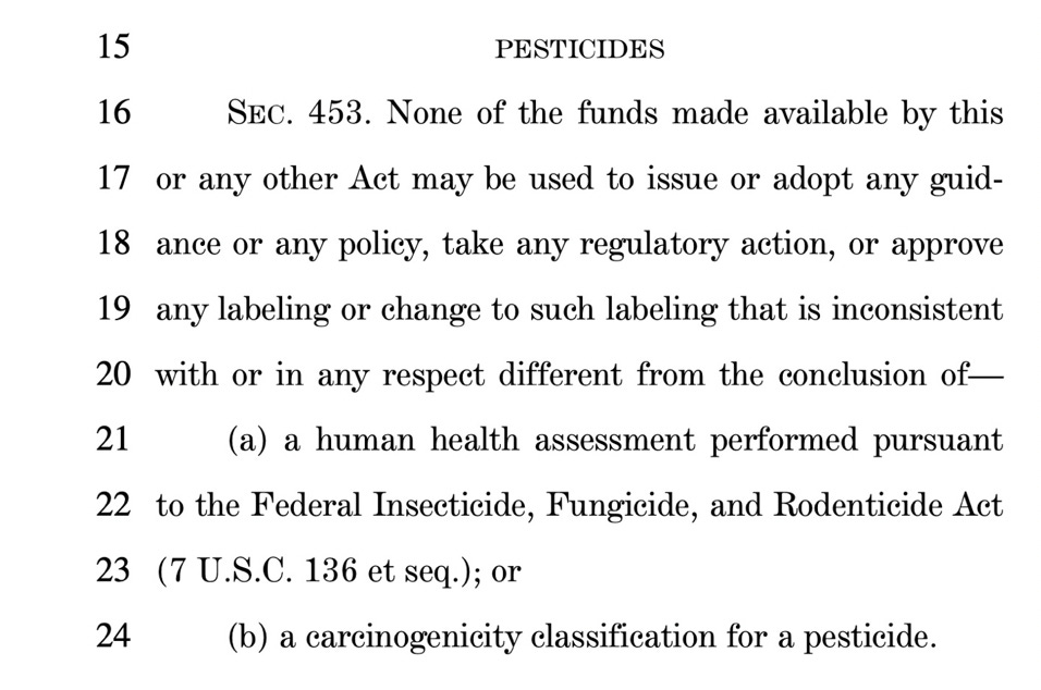 If passed, Section 453 will restrict the ability of pesticide companies to update warning labels on their products — even when evidence shows risks — unless the Environmental Protection Agency (EPA) undertakes a new full review of the chemical under Federal Insecticide, Fungicide, and Rodenticide Act (FIFRA), or makes a new carcinogenicity classification of it. Either of these options will take years, leaving millions of unaware Americans potential victims of their known risks.