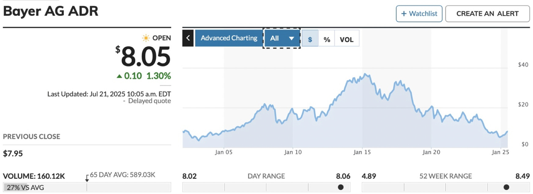 Bayer's stock has been dropping ever since it bought Monsanto. Eventually, about 177,000 potential lawsuits appeared. About 67,000 thousand have settled, at a cost to Bayer of $11 Billion dollars. Bayer's current share price is $8.05, less than a third of its value before the Monsanto purchase.