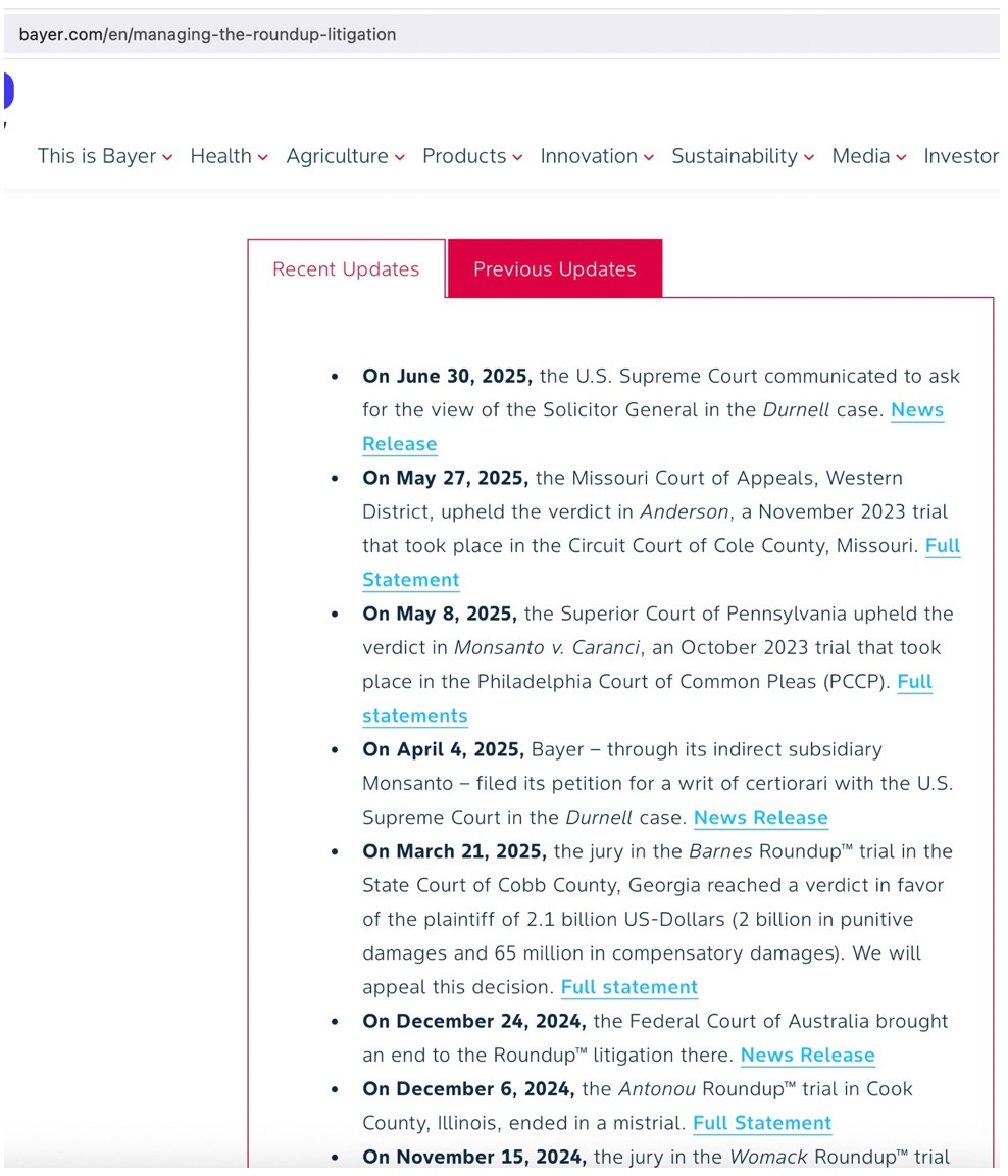 “The Supreme Court in 2022 declined to hear a similar claim from Bayer in a California case that awarded more than $86 million to a married couple,” Lieb reported. “But Germany-based Bayer, which acquired Roundup maker Monsanto in 2018, contends the Supreme Court should intervene now because lower courts have issued conflicting rulings.”
